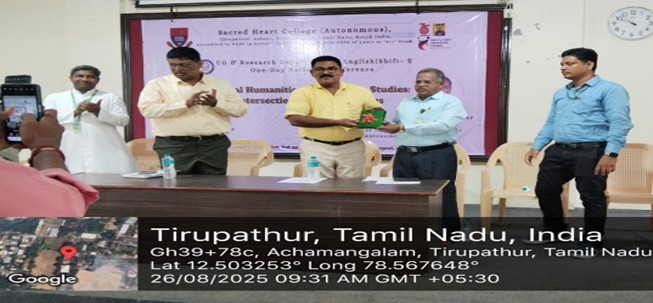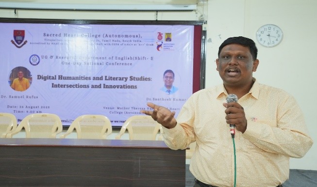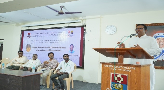 The Department of English (Shift I), Sacred Heart College (Autonomous), Tirupattur, organized a One-Day National Conference on “Digital Humanities and Literary Studies: Intersections and Innovations” on 26th August, 2025 at Mother Theresa Hall. The event was inaugurated in the presence of Prof. N. Arul Doss, Head, Department of English, faculty members, and distinguished participants. The inaugural address highlighted the need for integrating digital tools with literary studies to meet the demands of the evolving academic landscape. The conference featured two eminent scholars: Dr. Samuel Rufus, Associate Professor, Madras Christian College, Chennai, and Dr. L. Santhosh Kumar, Assistant Professor, Kristu Jayanti University, Bengaluru. Both resource persons delivered insightful lectures on the intersections of literature, culture, and digital innovation, while also engaging participants in discussions on new methodologies for research and pedagogy in the digital age. The academic sessions provided a dynamic platform for students, research scholars, and faculty members from Sacred Heart College as well as delegates from various other institutions across the region and beyond, to explore emerging perspectives in Digital Humanities. Paper presentations, interactive sessions, and deliberations enriched the conference, making it a significant academic milestone for the department. The day concluded with the Valedictory Session, where Rev. Fr. S. Henry Daniel Ambrose, SDB, Vice Principal, delivered the valedictory address, followed by the distribution of certificates. The Vote of Thanks was delivered by Mr. V.. Madhan Kumar, who expressed gratitude to the management, resource persons, delegates, and organizing committee for their support and contributions. The conference proved to be an inspiring and intellectually enriching experience, fostering collaboration and innovation at the intersection of literature and technology.