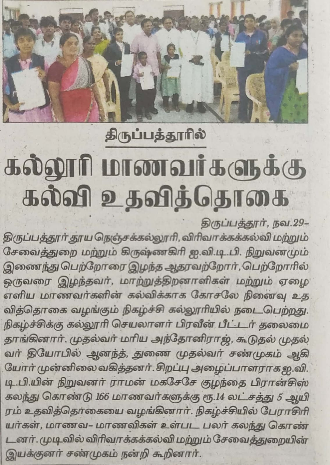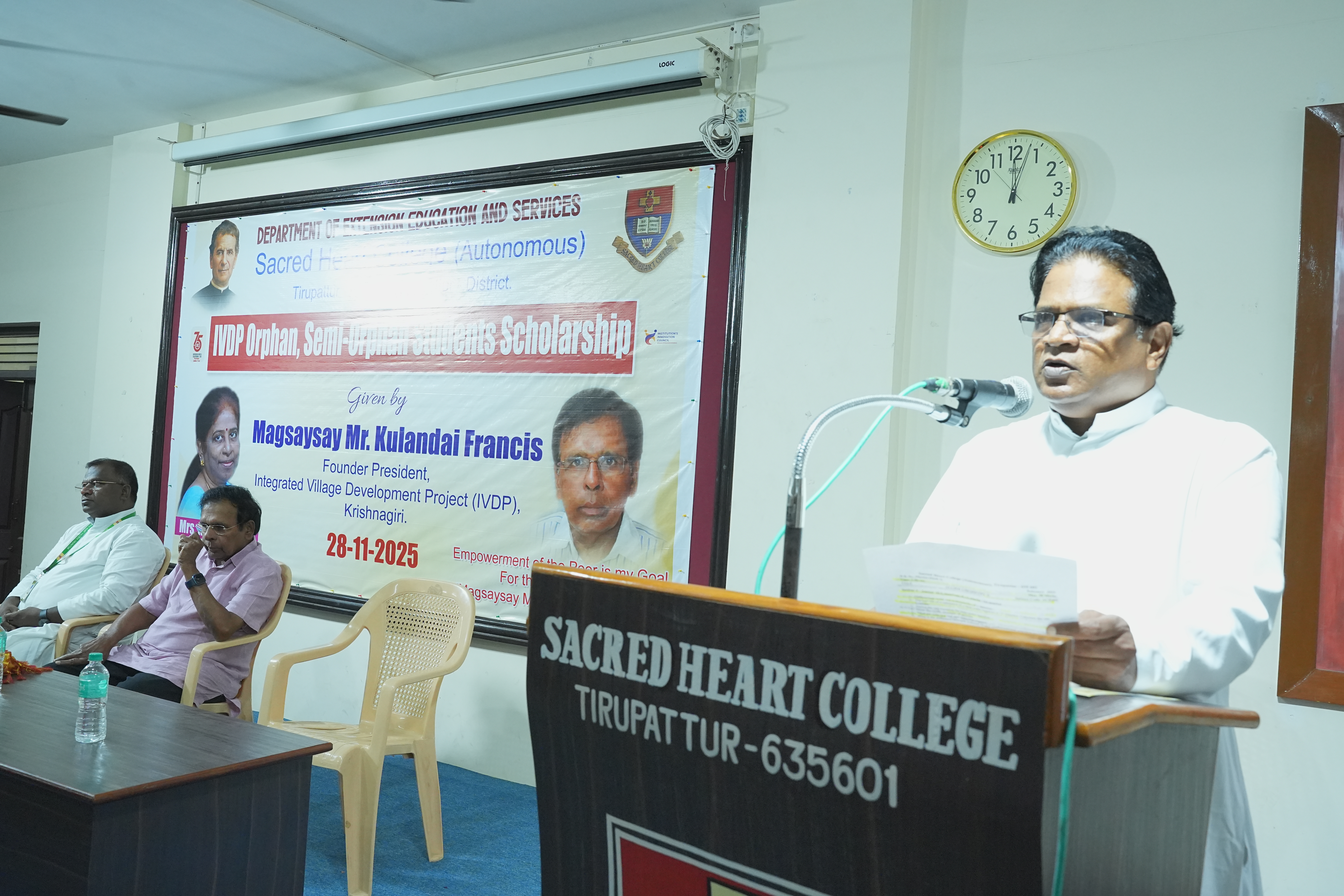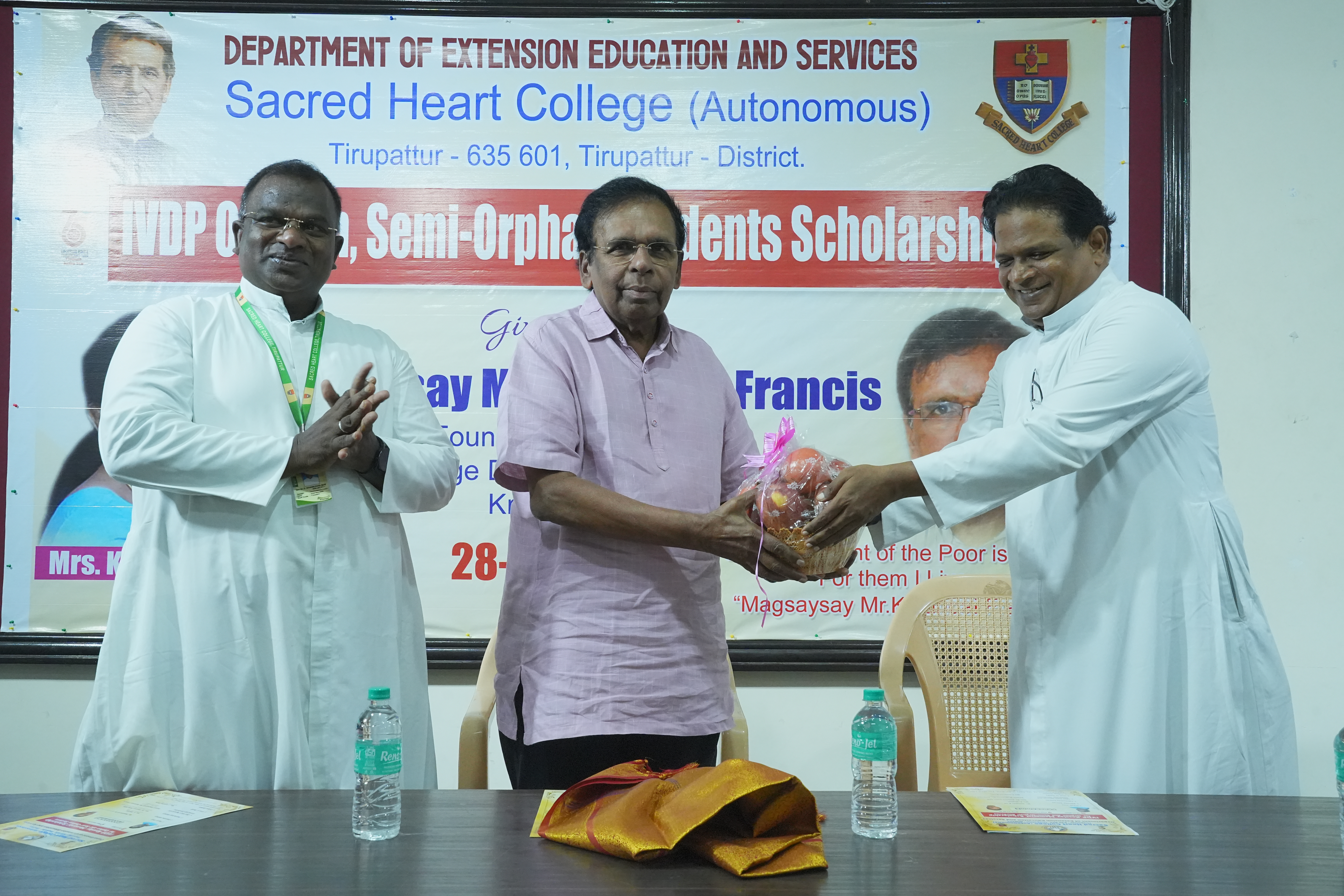 Department of Extension Education and Services of Sacred Heart College (Autonomous), Tirupattur, organized the IVDP Koseley Memorial Scholarship Distribution Programme on 28 November 2025 at 11.30 am in Pope Francis Hall. The event was graced by Ramon Magsaysay Awardee Mr. Kulandai Francis, Founder-President of the Integrated Village Development Project (IVDP), Krishnagiri, whose generous contribution supported the education of deserving students. A total of 166 students, including Orphan, Semi-Orphan, Physically Challenged, and Ultra-Poor categories, received scholarships amounting to Rs. 14,05,000/-, marking a remarkable gesture of compassion and service.