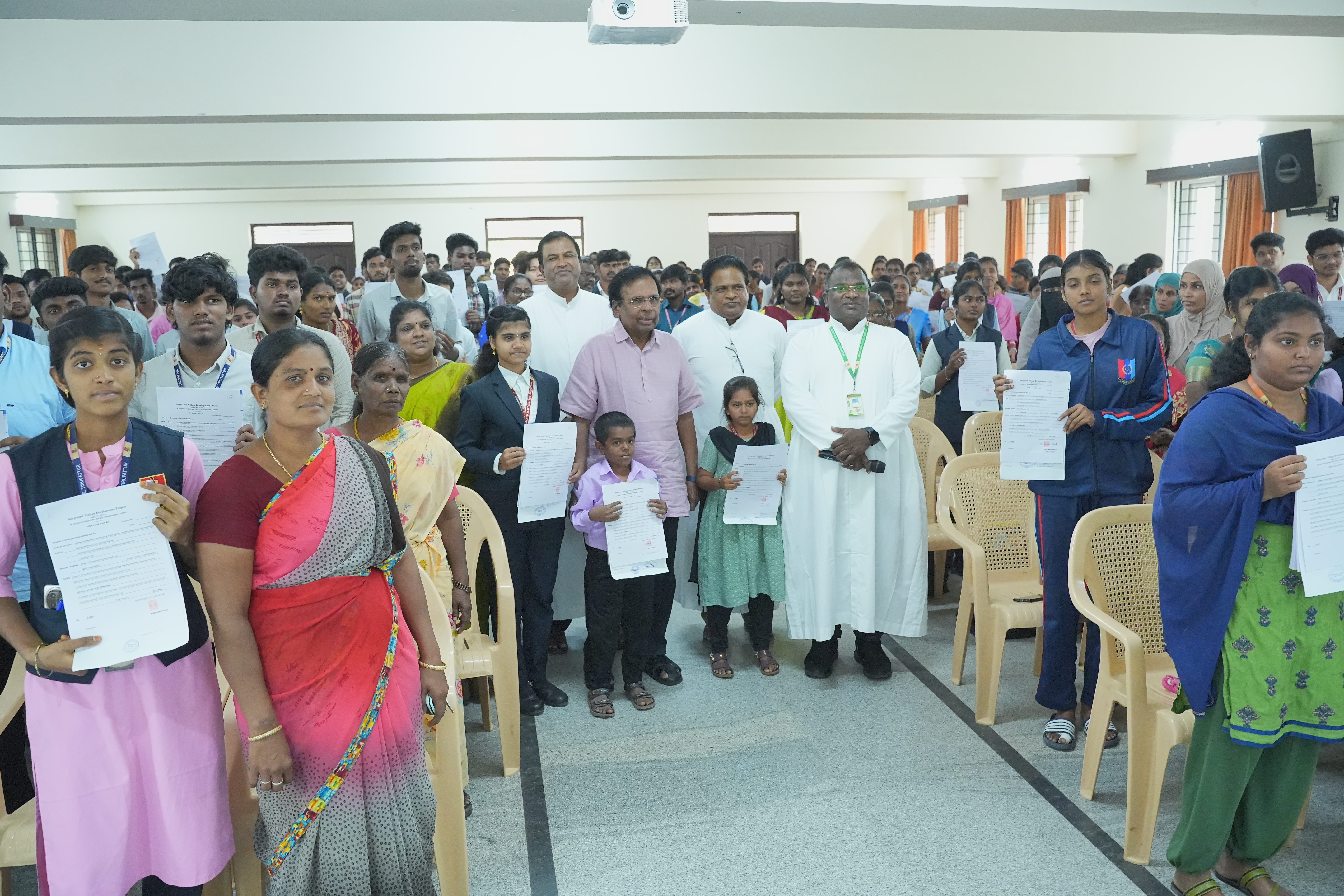 The programme commenced with a prayer song presented by Mr. Henston & team from the Department of English, followed by a warm welcome address by Ms. A. Shalini, M.A. Tamil (First Year). Rev. Dr. Praveen Peter SDB, Rector and Secretary of Sacred Heart College, delivered the felicitation address, appreciating IVDP’s longstanding commitment to social upliftment. The Honouring of the Chief Guest and the entire scholarship distribution process were gracefully coordinated under the guidance of Rev. Dr. Shanmugam, Director-DEEDS (DB Centre) ensuring the smooth flow of the event.