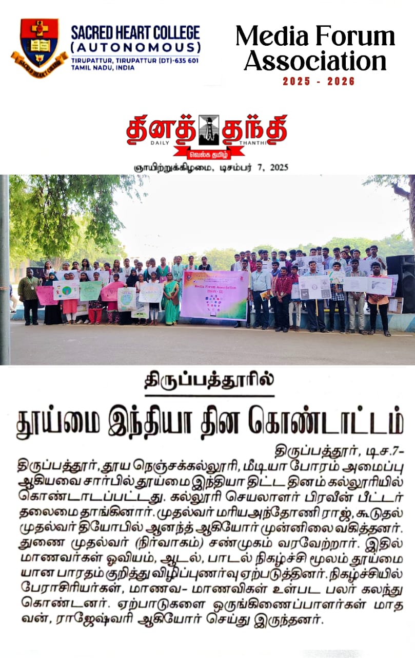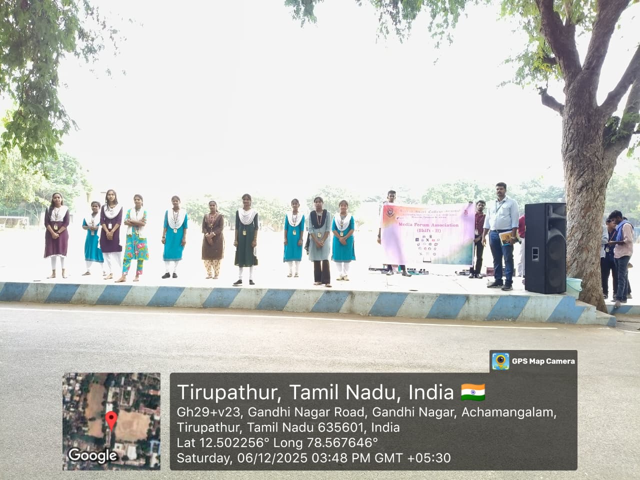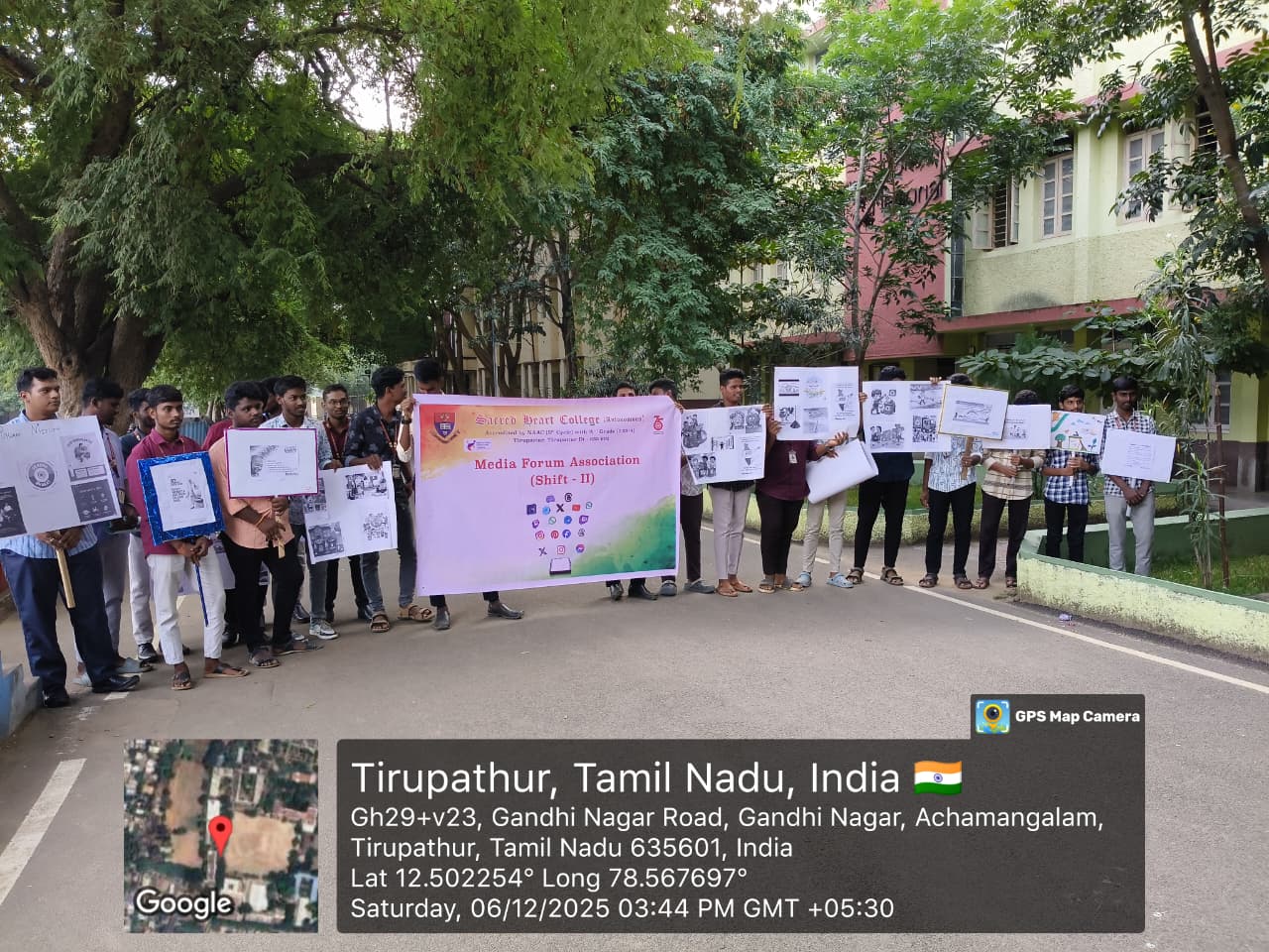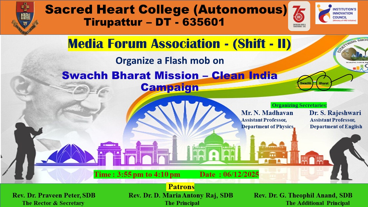 The Media Forum Association (Shift – II) of Sacred Heart College (Autonomous), Tirupattur organized a vibrant Flash Mob on the Swachh Bharat Mission – Clean India Campaign on 6th December 2025 from 3.55 p.m. to 4.10 p.m. The event was conducted on the college campus to create awareness on the importance of cleanliness, hygiene, and civic responsibility among students and the public.