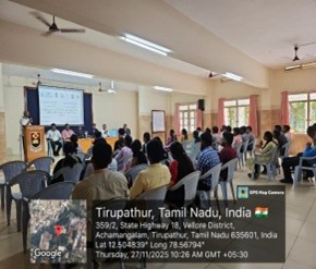 The PG & Research Department of Social Work, Sacred Heart College (Autonomous), Tirupattur organized an in-depth health awareness programme titled Students Participation and Awareness in the Eradication of Tuberculosis (NTEP)” on 27 November 2025. The programme was arranged in collaboration with two significant public health partners—Centre for Sustainable Rural Development & Research Studies (CSRDRS), VIT, Vellore and the Directorate of Public Health and Preventive Medicine, Vellore, functioning under the Government of Tamil Nadu. The event commenced with a warm and graceful welcome by Rev. Fr. J. Andrews Raja, who invited the participants into a reflective understanding of the day’s theme. Mr. Babu, alumnus of the Department of Social Work and a representative from VIT, addressed the gathering. Dr. C. R. Christi Anandan, Head of the Department of Social Work, delivered a comprehensive overview of the theme. The main session of the programme was delivered by Mr. Mahesh, an expert from the District TB Centre in Vellore. Mr. Thangarasan, Health Educator from the Vellore TB Centre, provided a concise yet powerful recap of the key points discussed. The programme concluded with a heartfelt vote of thanks delivered by Dr. K. Arockia Raj, who expressed gratitude to the resource persons, coordinators and students for making the session meaningful.