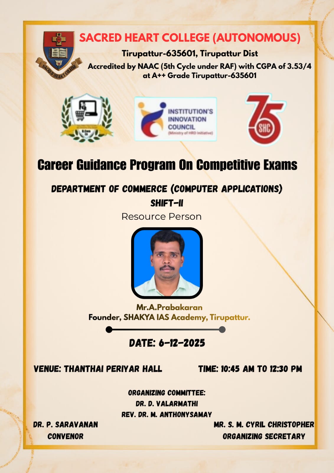 The Department of Commerce (Computer Applications) – Shift II of Sacred Heart College (Autonomous), Tirupattur, organized a Career Guidance Program on Competitive Exams on 6th December 2025 at Thanthai Periyar Hall. The program was conducted as a part of the department’s continuous efforts to guide students toward various competitive examinations and equip them with the necessary insights for career advancement.