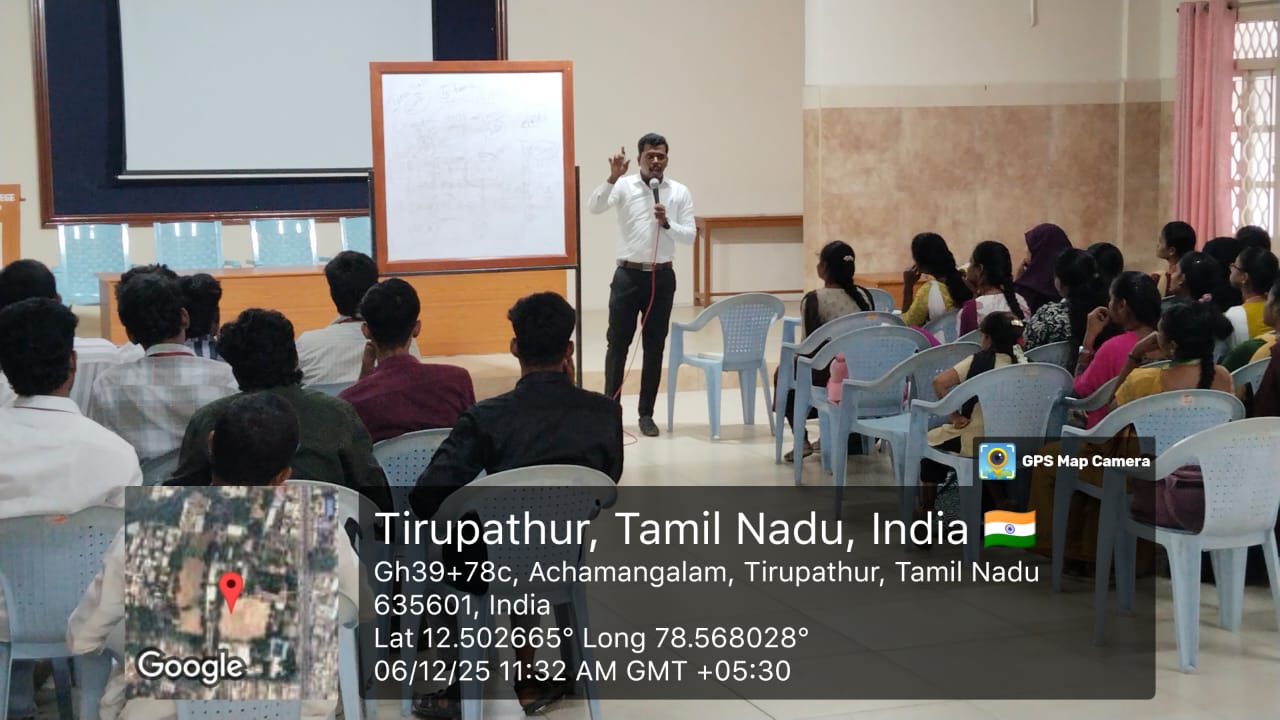 The session began at 10:45 AM and witnessed enthusiastic participation from students of the department. The resource person for the program was Mr. A. Prabakaran, Founder of Shakya IAS Academy, Tirupattur, who is well-known for his expertise in civil services coaching and career counselling.