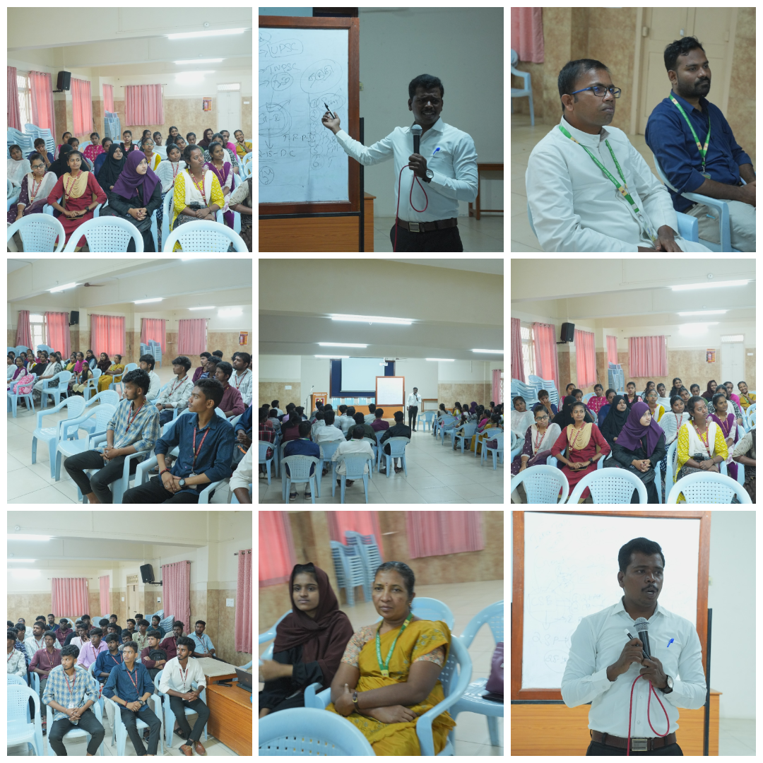 Mr. Prabakaran delivered an informative and inspiring talk, focusing on the wide range of competitive exams available for students after graduation. He elaborated on the structure of national and state-level examinations, including UPSC, TNPSC, SSC, banking exams, and other central government recruitment processes. He emphasized the importance of consistent preparation, smart study strategies, and staying updated with current affairs. His real-life examples and motivational insights encouraged students to set clear goals and work toward them with determination.