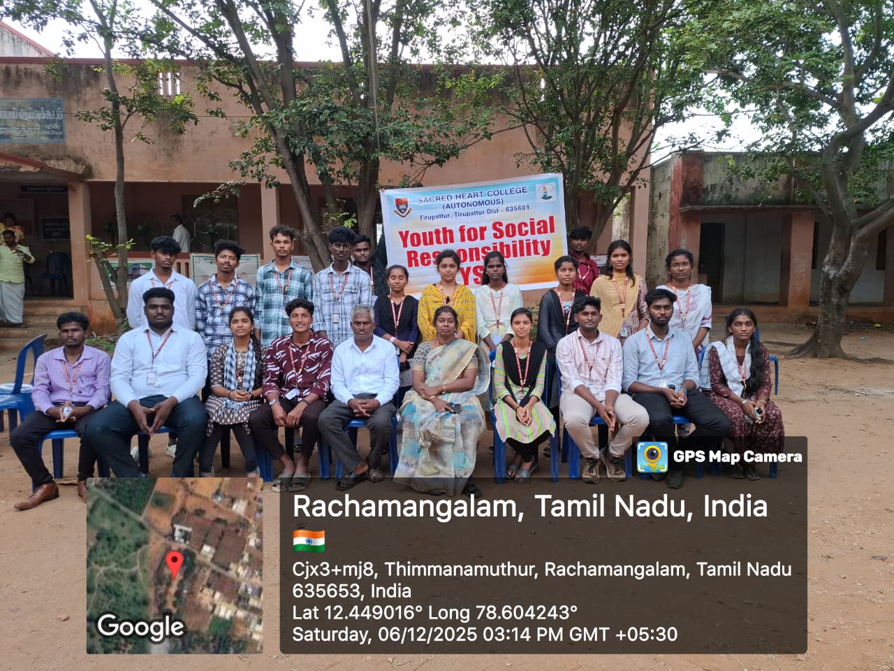 Youth for Social Responsibility (YSR) group of Sacred Heart College (Autonomous), Tirupattur, Shift–II, enthusiastically volunteered in the Nalam Kakkum Stalin Medical Camp held at Thiminamarathur, Tirupattur District, on 6th December 2025. A dedicated team of 30 YSR student volunteers stepped forward to contribute their service to this noble community-health initiative, demonstrating their commitment to social responsibility and compassionate outreach. The presence and encouragement of Rev. Dr. G. Theophil Anand, Additional Principal, and Rev. Dr. Shanmugam, Vice-Principal (Admin) and the in-charge of the YSR team, greatly motivated the volunteers. Their inspiring guidance strengthened the students’ enthusiasm and deepened their sense of duty toward serving society.