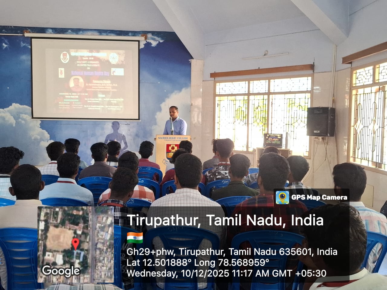 AICUF Shift-II of Sacred Heart College (Autonomous), Tirupattur, organized an Invited Talk and Debate on National Human Rights Day on 10 December 2025 at the Oasis Hall. The event began with a welcome address by Ms. G. Dharshini, II B.Sc. Computer Science, followed by Ms. Maria Keerthana, II B.A. English introducing the resource person. Ms. Harini, II B.Sc. Computer Science served as the Master of Ceremony.