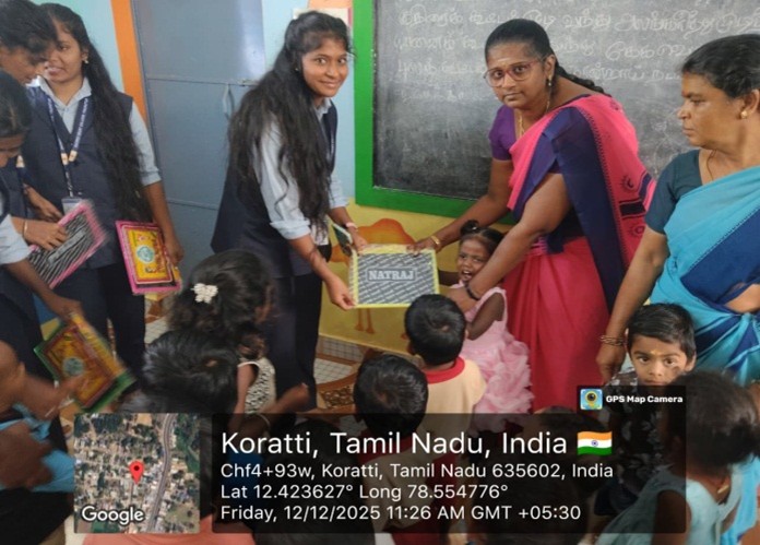 The “Sharing Day” of the Department of English (Shift-I) for the academic year 2025-2026 was conducted on 12th December, 2025 between 10.30 am to 12.30 pm at Koratti, Creche, Tirupattur. Around 45 students accompanied by 2 faculties went to the Creche. The kids were happy and cheerful watching the various programs organized by the students. As planned, programs were executed. Gifts with stationery items including water bottles, cakes, and candies were distributed to the kids. Totally 25 Children of Koratti Creche were benefitted.