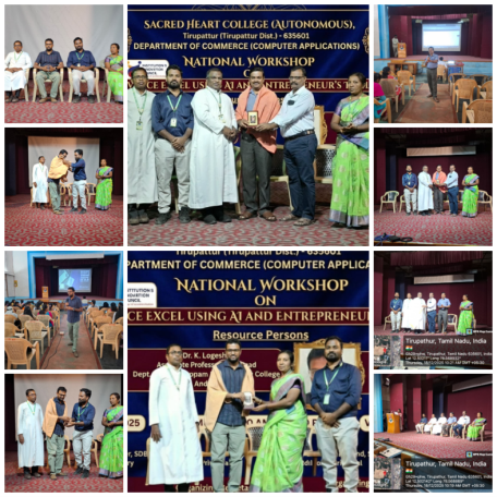 The National Workshop on “Advance Excel Using AI and Entrepreneur’s Tool Kit” was organized by the Department of Commerce (Computer Applications), Sacred Heart College (Autonomous), Tirupattur, on 18th December 2025 at Carreno Hall, from 10.00 a.m. to 4.30 p.m. The program was conducted under the auspices of the Institution’s Innovation Council (IIC) with the objective of enhancing students’ analytical, technological, and entrepreneurial skills. The workshop commenced with a formal inaugural session. The dignitaries on the dais highlighted the importance of Advanced Excel skills integrated with Artificial Intelligence and their relevance in today’s data-driven and entrepreneurial environment. The workshop featured two eminent Resource Persons.