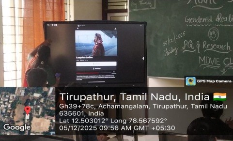 The PG and Research Department of English (Shift II) in collaboration with the English Movie Club, Sacred Heart College (Autonomous), Tirupattur, organized a film screening titled “Gendered Realities on Screen: Film Screening” on 5th December 2025 at 9:30 a.m. Dr. J. Mary Jenif, Head, Department of English and faculty members graced the event. The film “Laapataa Ladies” was screened as it offers a compelling portrayal of the multiple layers of gender roles, identity formation, patriarchy, social expectations, and women’s struggle for self-realization. Dr. U. Maria Liny Jenifer and Dr. S. Rajeshwari coordinated the event.