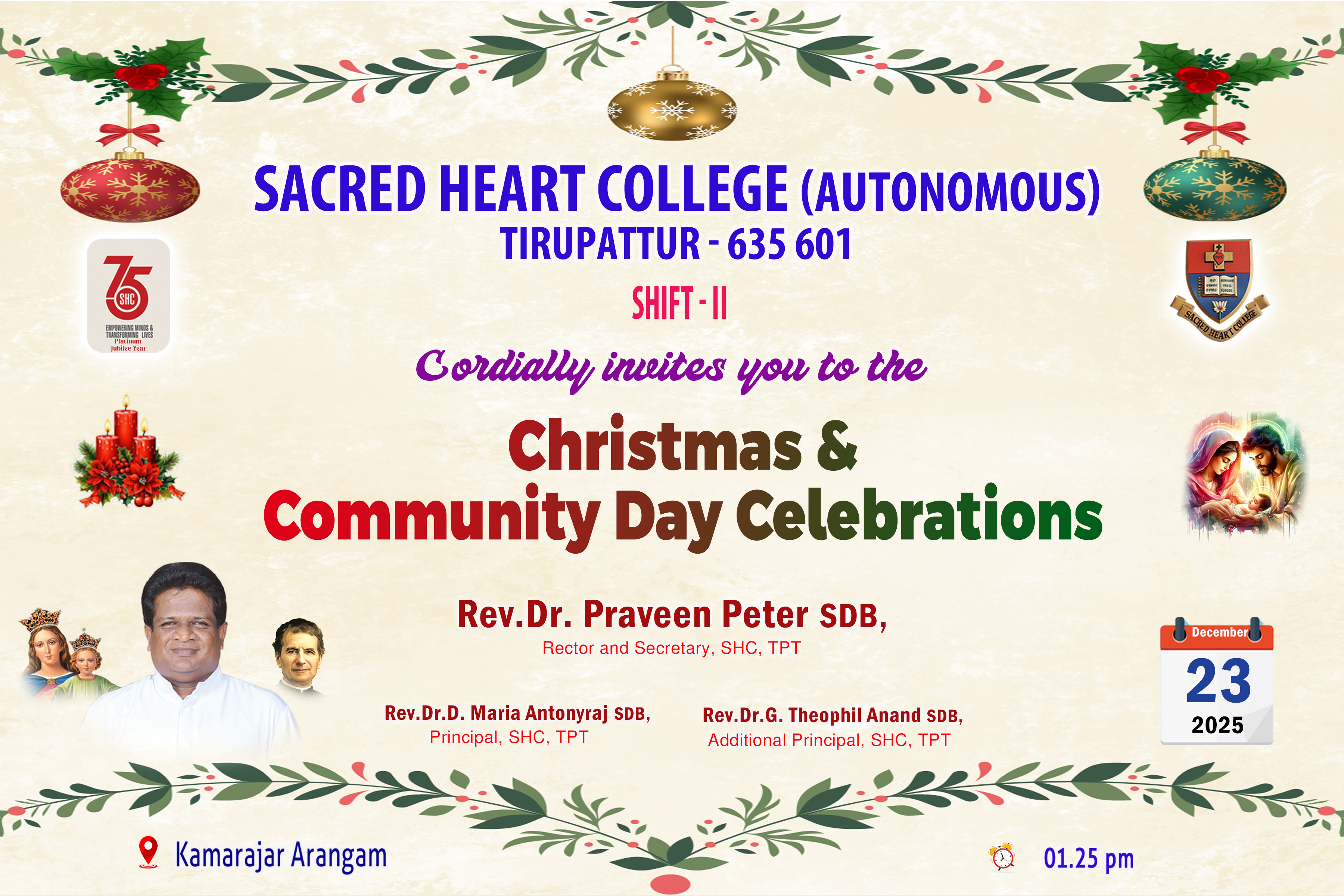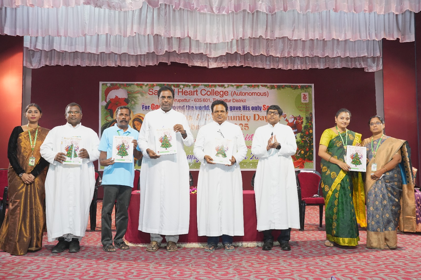 Christmas and Community Day Celebrations 2025 of Sacred Heart College (Autonomous), Tirupattur, Shift–II, were celebrated with great joy, reverence, and enthusiasm on 23rd December 2025 at Kamarajar Arangam, commencing at 1.25 p.m. The programme began with a solemn Prayer Service and melodious Christmas carols, which created a spiritually uplifting atmosphere and reminded the gathering of the true essence of Christmas—peace, love, and goodwill. The celebration was formally inaugurated with a warm welcome and Christmas and Community Day message delivered by Rev. Dr. G. Theophil Anand SDB, Additional Principal, SHC, Tirupattur.