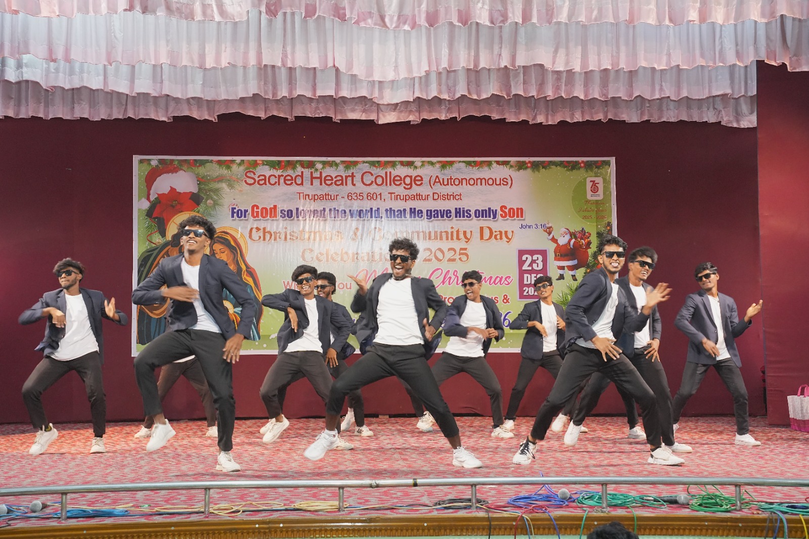The celebration was further enriched by the Christmas and Community Day message delivered by Rev. Dr. Praveen Peter SDB, Rector and Secretary, SHC, Tirupattur,. Another elegant dance performance by Dr. Maria Liny Jenifer and team from the Department of English added charm to the cultural celebrations. The programme concluded with a heartfelt Vote of Thanks proposed by Ms. S. Sowmini, Department of Computer Science, acknowledging all dignitaries, organizers, participants, and students for their support and cooperation. The celebration came to a dignified close with the singing of the College Anthem,. The entire programme was meticulously coordinated by Rev. Dr. Shanmugam, Vice-Principal (Administration), Shift–II, whose effective leadership ensured the smooth, disciplined, and meaningful conduct of the Christmas and Community Day Celebrations.