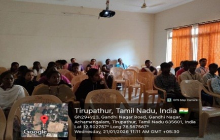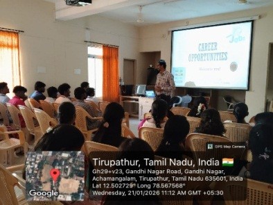 The Placement Cell, PG & Research Department of English (Shift–II) of Sacred Heart College (Autonomous), organised an Orientation Programme on Career Opportunities on 21 January 2026 at 11.00 a.m. The Orientation was conducted for the students to create awareness about diverse career paths and higher study options available after studying B.A. & M.A. English. The session was handled by Mr. U. Kamesh, Assistant Professor of English, Sacred Heart College (Autonomous), Tirupattur. The programme began with an introduction to the importance of career planning and the relevance of English studies in the contemporary job market. The speaker explained various career opportunities after B.A. & M.A. English. The session also highlighted higher studies available after both B.A. and M.A. English, including professional courses, diploma and certification programmes, and cross-major or interdisciplinary courses that enhance employability. A special segment on Myths vs Reality helped students understand that English offers wide job opportunities and that skills matter more than marks alone. The programme concluded with guidance on essential skills. The session motivated the final year students to plan their careers early, focus on skill development, and remain open to continuous learning. The programme was organised under the convenorship of Dr. J. Mary Jenif, Head and Mr. U. Kamesh, Placement In-charge, Dept. of English. Totally 36 final year students of both B.A. and M.A. English got benefitted.