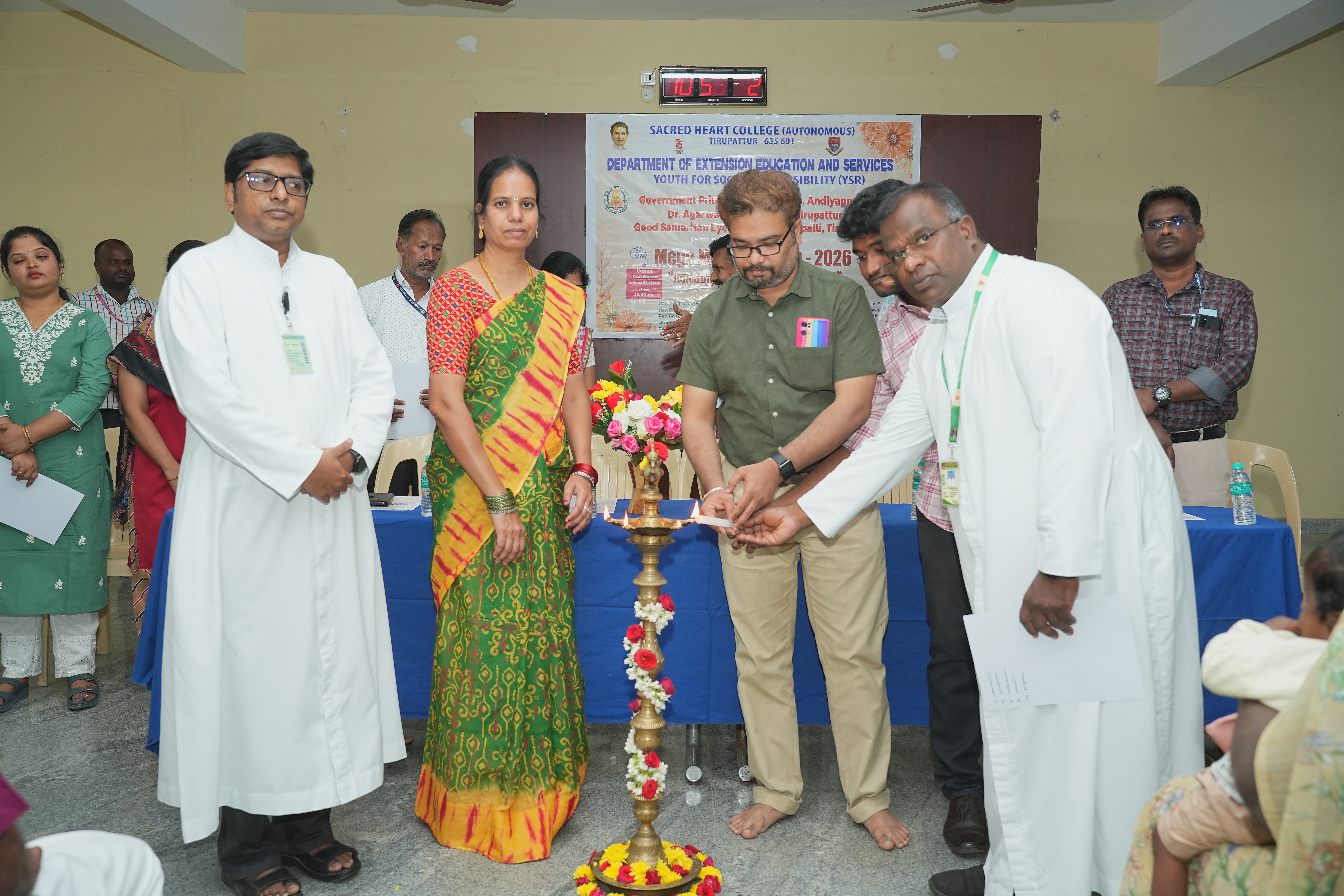 Department of Extension Education and Services (DEEDS) and Youth for Social Responsibility (YSR) of Sacred Heart College (Autonomous), Tirupattur, successfully organized a Mega Medical Camp – 2026 on 29th January 2026 at Don Bosco Indoor Stadium, Tirupattur, in collaboration with the Government Primary Health Centre, Andiyappanur, Dr. Agarwal’s Eye Hospital, Tirupattur, and Good Samaritan Eye Hospital, Matrapalli. The medical camp was specially organized for Women Self Help Group members and their family members, aiming to promote preventive healthcare and early diagnosis.