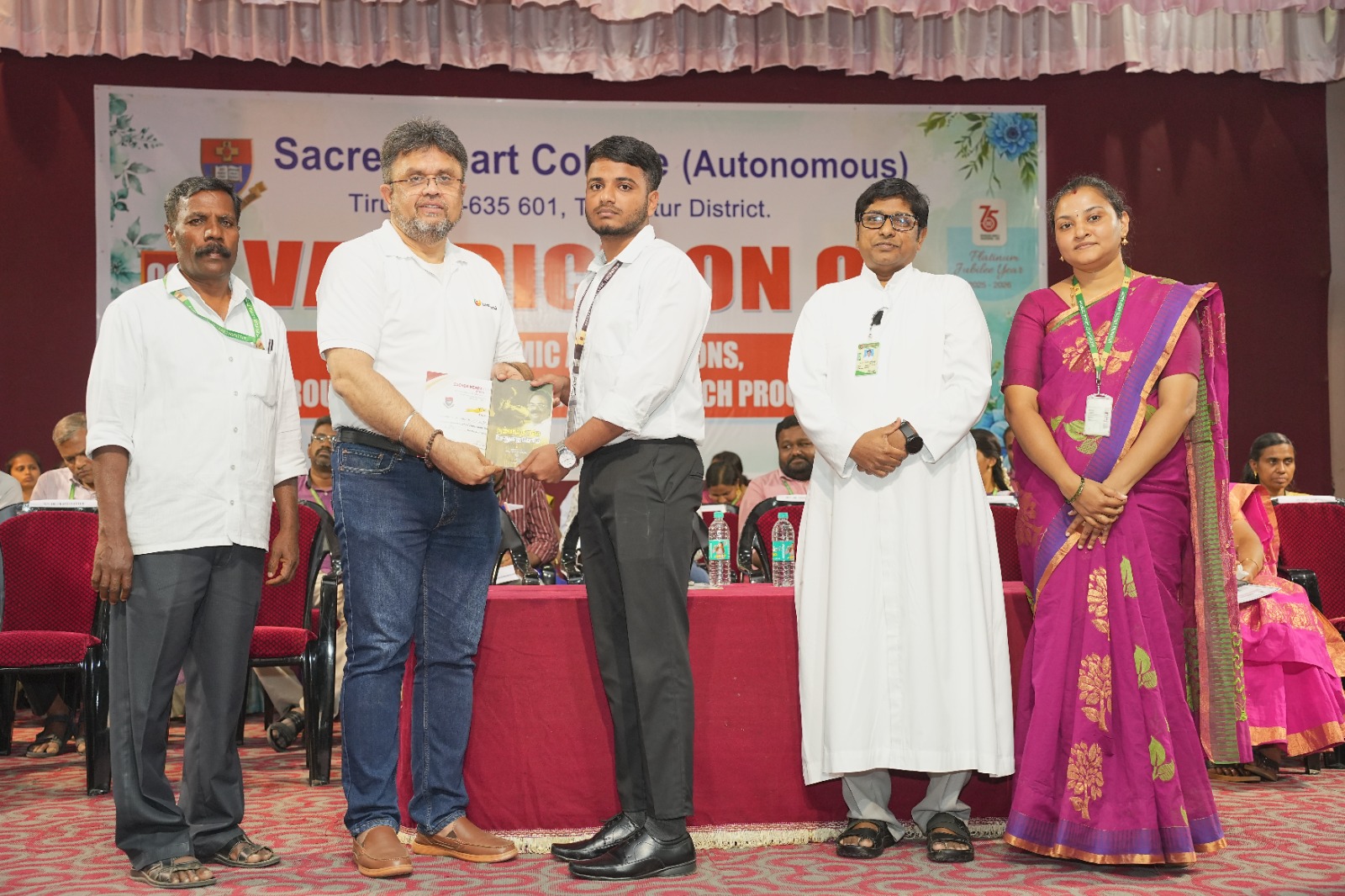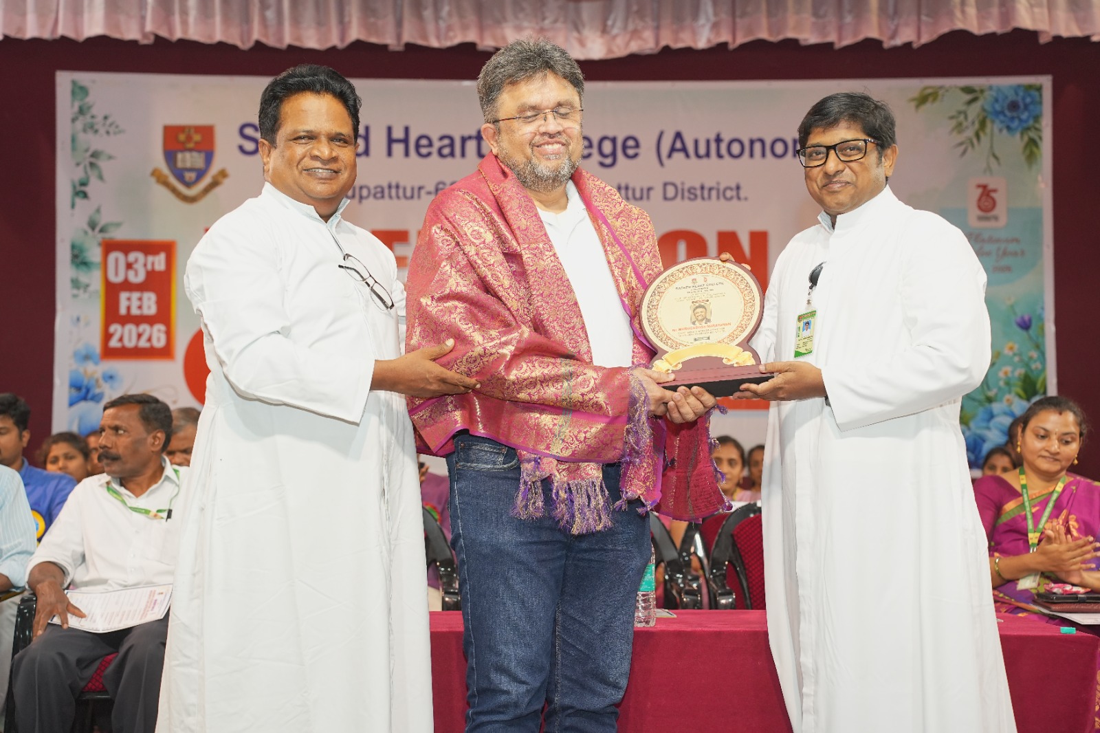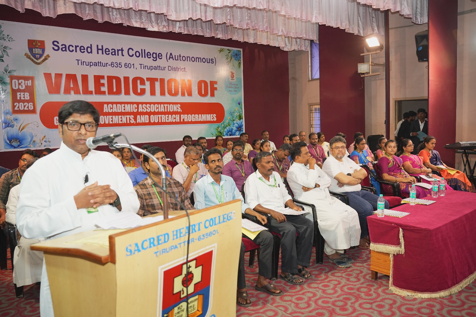 Valediction of Academic Associations, CQC, Groups and Movements and Outreach Programme of Shift–II was organized by Sacred Heart College (Autonomous), Tirupattur, on 3rd February 2026 at Kamarajar Arangam, commencing at 3.45 p.m. The programme began with a prayer song by Mr. Henston and team from the Department of English, setting a reverential tone for the event. Rev. Dr. G. Theophil Anand SDB, Additional Principal, SHC, Tirupattur, delivered the welcome address and explained the dynamics of the day. Rev. Dr. Praveen Peter SDB, Rector and Secretary of the college, felicitated and honoured the Chief Guest. The Newsletter was formally released by Rev. Dr. Shanmugam SDB, Director of DEEDS and Outreach Programme.