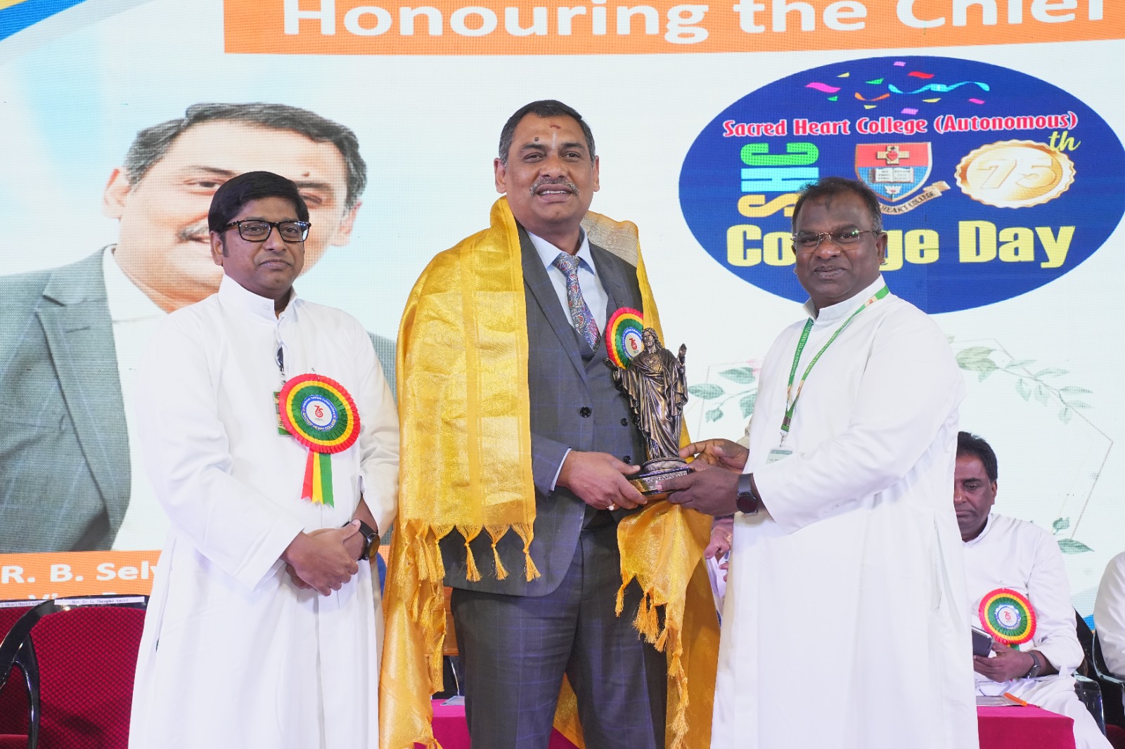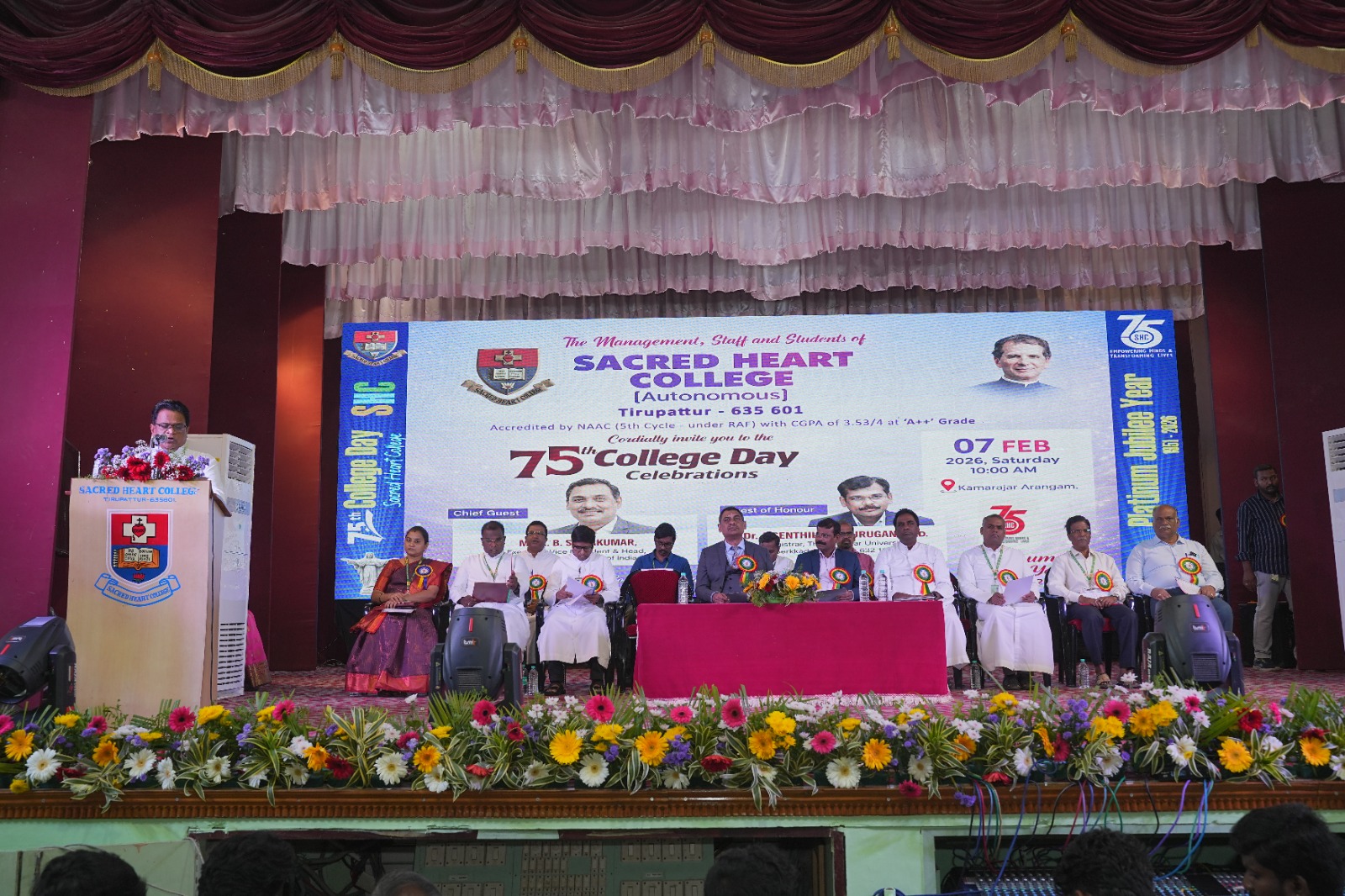 Sacred Heart College (Autonomous), Tirupattur, celebrated its 75th College Day with great splendour and academic pride on 7th February, 2026 at Kamarajar Arangam. The Platinum Jubilee milestone brought together the Salesian Management, distinguished dignitaries, faculty, students, parents, and alumni in a collective celebration of the institution’s enduring legacy.