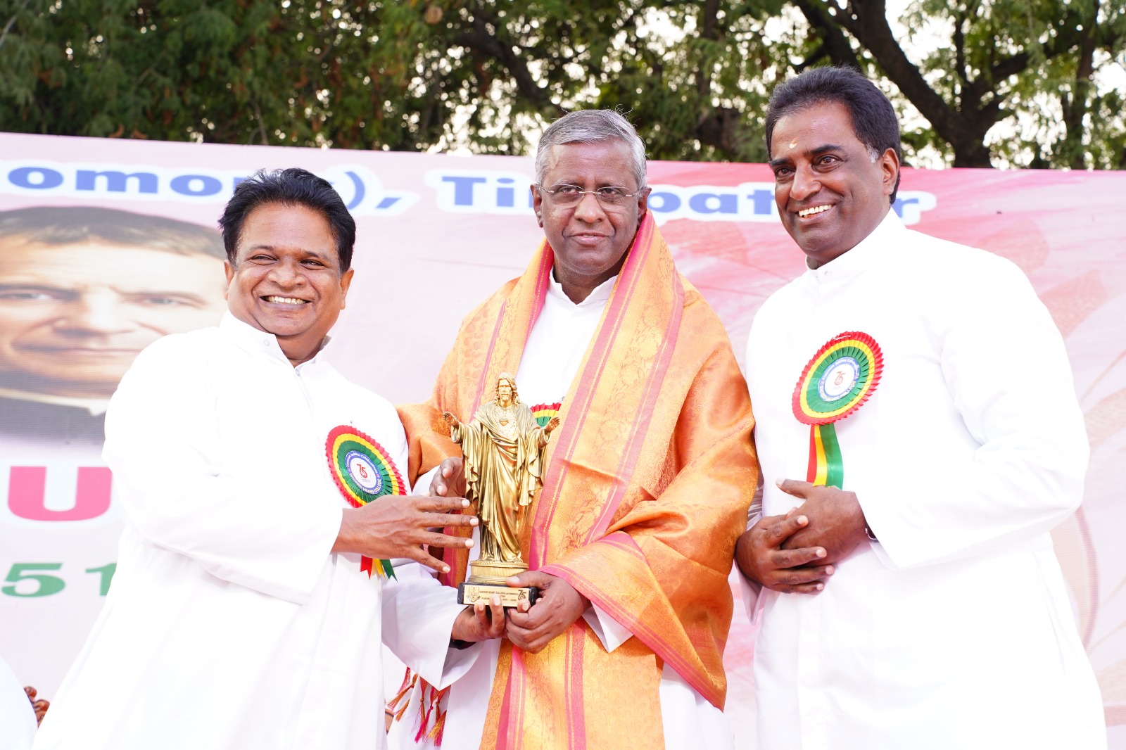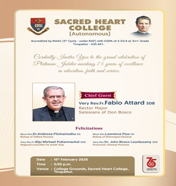 The Platinum Jubilee of Sacred Heart College (Autonomous), Tirupattur, commemorating 75 illustrious years of academic excellence and transformative educational service, was celebrated with grandeur and solemn splendour on the college campus in the august presence of eminent dignitaries, distinguished alumni, faculty members, and students. The historic celebration commenced with Tamizh Thaai Vaazhthu, followed by a reverential prayer song. The ceremonial lighting of the Platinum Jubilee Lamp stood as a resplendent symbol of the institution’s seventy-five years of enlightened mission in higher education.