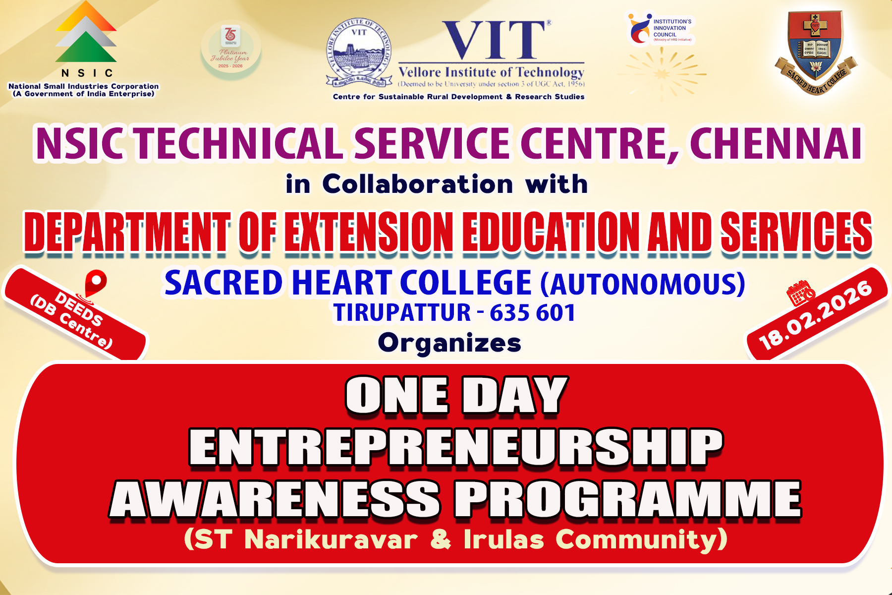 Department of Extension Education and Services (DEEDS – DB Centre), Sacred Heart College (Autonomous), Tirupattur, in collaboration with NSIC Technical Service Centre, Chennai, and the Centre for Sustainable Rural Development & Research Studies (CSRD&RS), VIT Vellore, organized a One Day Entrepreneurship Awareness Programme on 18th February 2026. The programme was specially designed for the ST Narikuravar and Irulas community with the objective of promoting entrepreneurial skills and self-employment opportunities.