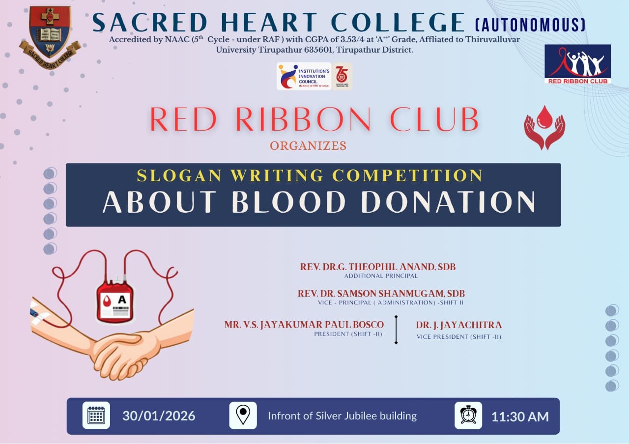 A Slogan Writing Competition was successfully organized by the Red Ribbon Club, Shift II, on 30/01/2026 (Friday )with the aim of creating awareness among students about social and health-related issues and encouraging creative expression. The programme was organized and coordinated by Mr. V. S. Jayakumar Paul Bosco and Dr. J. Jayachitra. The competition witnessed enthusiastic participation from students, who expressed their thoughts through impactful and meaningful slogans. The event provided a platform for students to showcase their creativity, awareness, and communication skills. The judges appreciated the originality and clarity of the slogans presented by the participants. The competition concluded successfully, fulfilling its objective of promoting awareness and student involvement through creative activities. The Red Ribbon Club, Shift II, extends its gratitude to the organizers and participants for making the event a grand success.