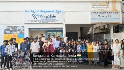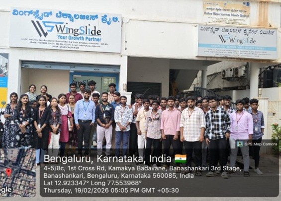 The Department of Computer Science (Shift–II) organized an industrial visit to Wing Slide Private Limited, Bengaluru, Karnataka, on 19th February 2026, in which a total of 102 students from I, II, and III B.Sc. Computer Science participated, accompanied by four female faculty members and one male faculty member. The primary objective of the visit was to provide students with practical exposure to the IT industry and to bridge the gap between academic learning and real-time industrial practices. The session commenced with a welcome address by the company’s HR team Mr Nandhish Kumar A T, Corporate Relations and Trainer, followed by an informative presentation about the company’s vision, services, and ongoing projects. Students gained insights into software development processes, Agile methodology, teamwork, project management, and emerging technologies such as Artificial Intelligence, Cloud Computing, Full Stack Development, and Cyber Security. A live demonstration of project workflows was also presented, helping students understand how programming concepts are applied in real-world scenarios. The interactive session allowed students to clarify their doubts regarding internships, placement opportunities, required technical skills, and career growth in the IT sector. Overall, the industrial visit was highly informative and beneficial, enhancing students’ technical knowledge, industry awareness, and motivation to develop both professional and soft skills.