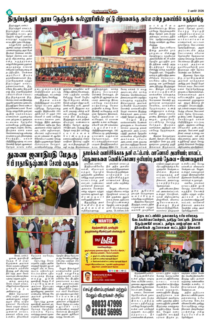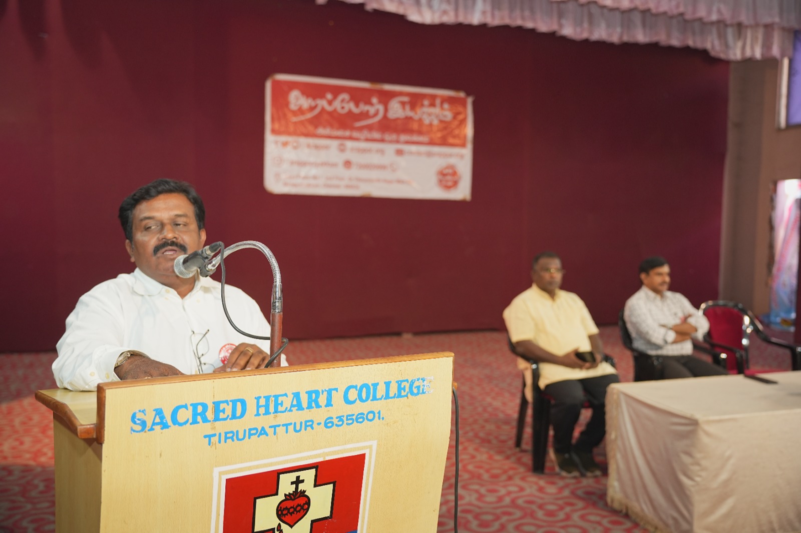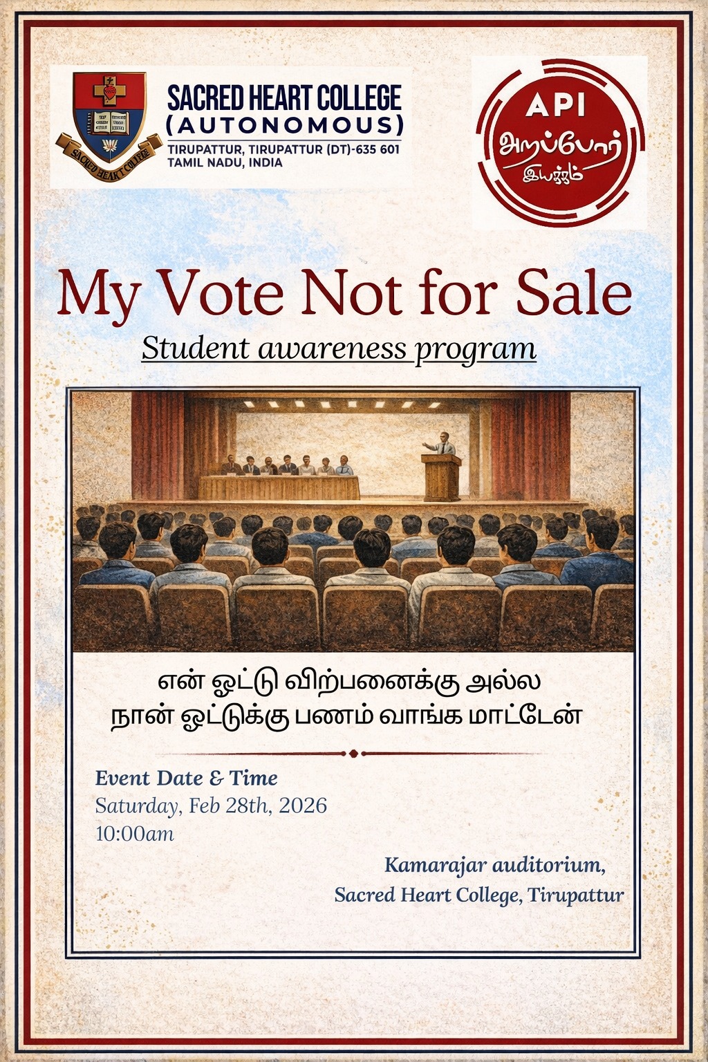 Sacred Heart College (Autonomous), in collaboration with Arapor Iyakkam, organized a Student Awareness Program titled “My Vote is Not for Sale” on 28th February 2026 at 10.00 a.m. in the Kamarajar Auditorium. The program aimed to create awareness among students about the importance of ethical voting and responsible citizenship. The event began with a prayer song followed by a warm welcome address delivered by Rev. Dr. Shanmugam, who highlighted the significance of youth participation in strengthening democracy. He emphasized that voting is not merely a right but a moral responsibility of every citizen.
