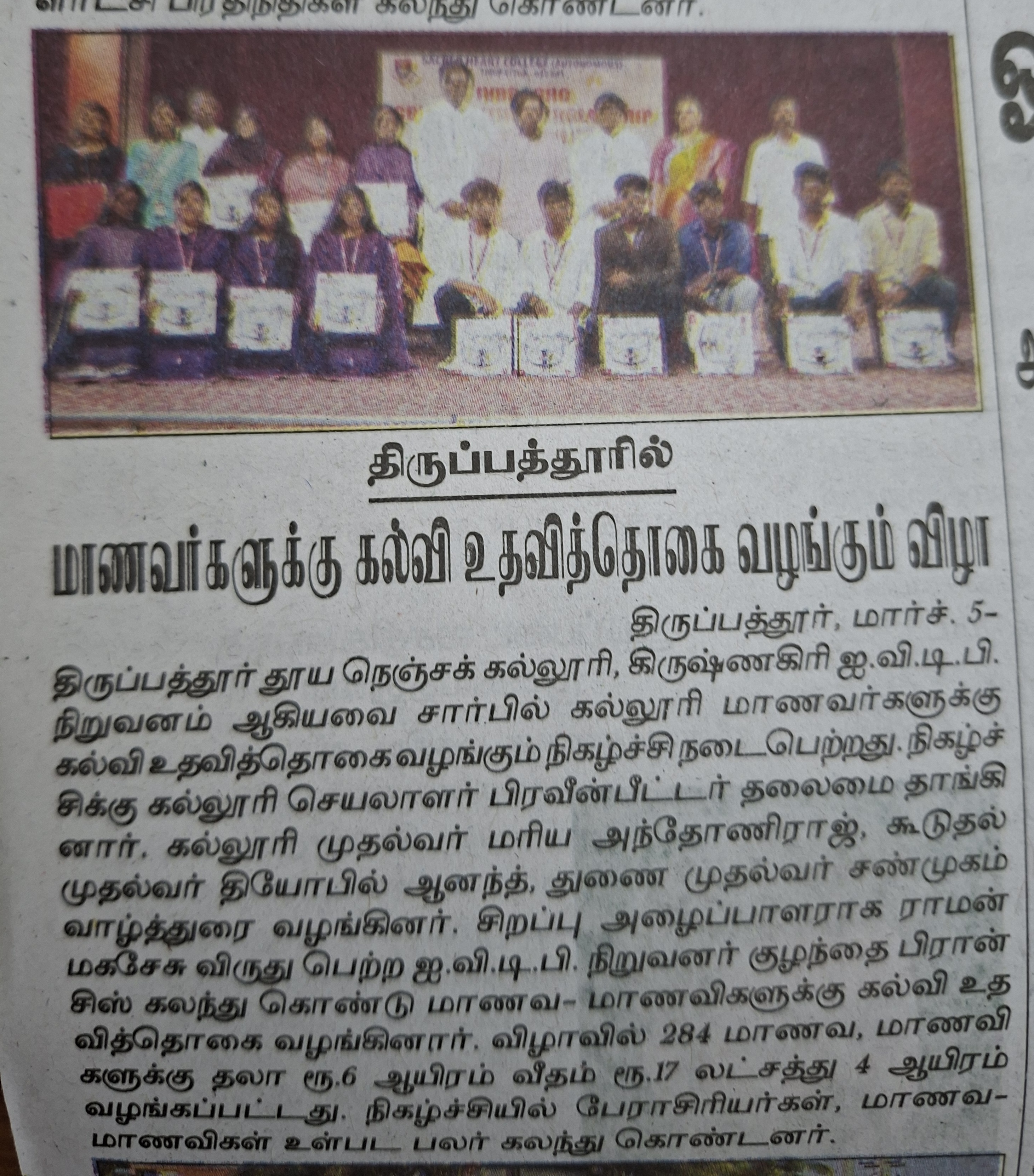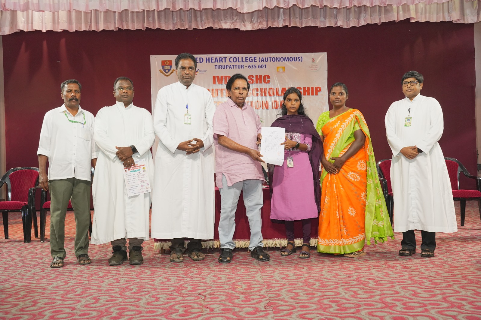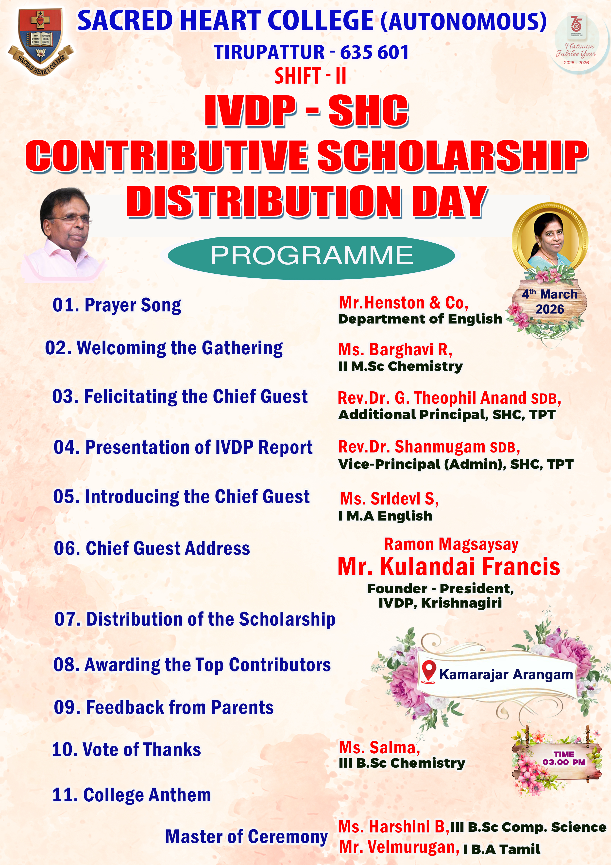 IVDP–SHC Contributive Scholarship Distribution Day was organized by Sacred Heart College (Autonomous), Tirupattur, at Kamarajar Arangam on 4th March 2026 at 3.00 p.m. under Shift–II. The programme was conducted to extend financial assistance to orphans, semi-orphans, and economically disadvantaged students through the collaborative initiative of IVDP and Sacred Heart College. The event was graced by the Chief Guest, Raman Magsaysay Awardee Mr. Kulandai Francis, Founder–President of IVDP, Krishnagiri. The programme commenced with a prayer song by Mr. Henston & Co., Department of English, invoking divine blessings. Ms. Barghavi R., II M.Sc Chemistry, delivered the welcome address and greeted the dignitaries, faculty members, students, and parents.