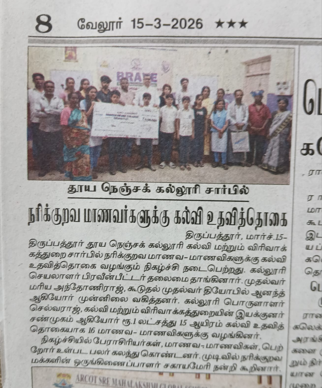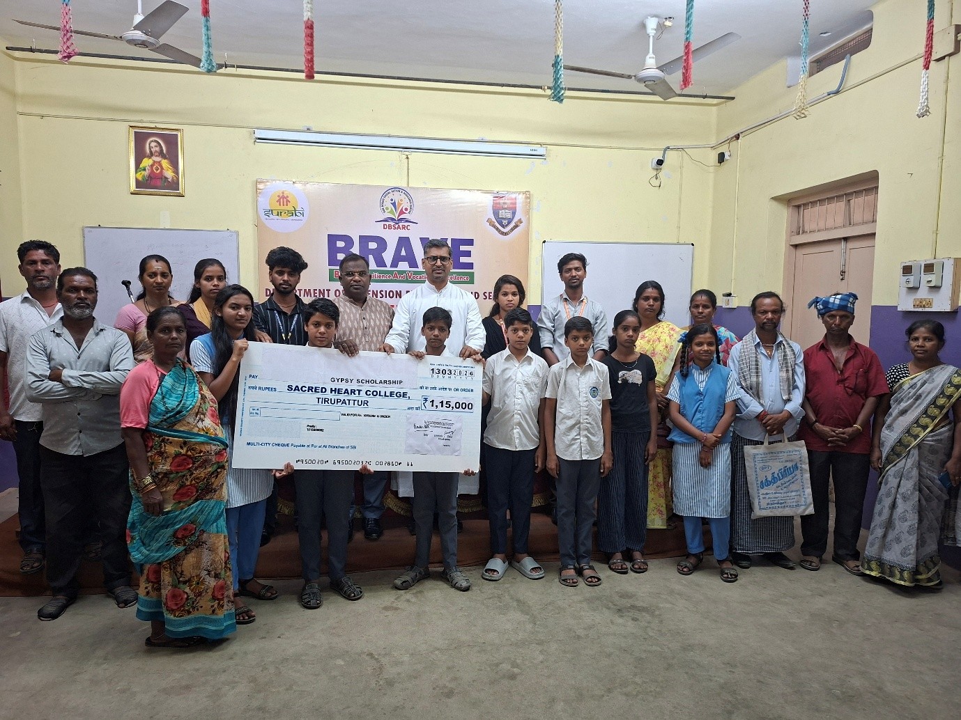 Department of Extension Education and Services (DEEDS) of Sacred Heart College (Autonomous), in collaboration with Don Bosco Social Action Research Centre (DBSARC), Tiruvannamalai, organized a scholarship distribution programme for Gypsy students on 13th March 2026 at the DEEDS – DB Centre. During the programme, a total amount of Rs. 1,15,000 was distributed to 16 Gypsy students to support their educational needs. The scholarship beneficiaries included 8 college students and 8 school students from economically marginalized gypsy communities.